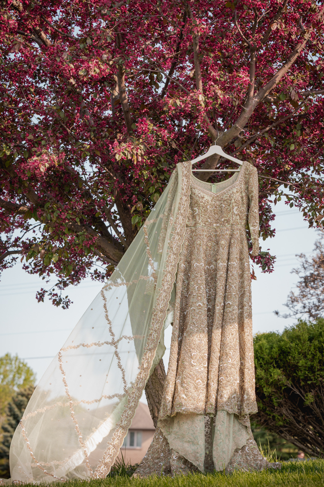 A beautiful, intricately designed dress hangs on a hanger from the branch of a blossoming tree with deep pink flowers. The dress features elaborate embroidery and is accompanied by a flowing, sheer dupatta with delicate patterns. The background shows greenery and a house.