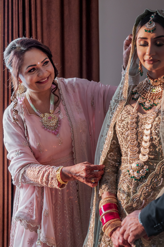 A woman, smiling in a light pink traditional outfit with ornate jewelry, assists another woman dressed as a bride in an intricate, heavily embroidered dress with a veil. The image captures an intimate moment filled with joy and elegance.