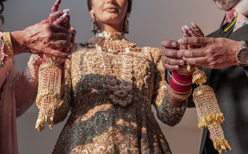 A bride in an ornate dress adorned with jewelry stands between two people, each person holding her hands. The bride's intricate mehndi designs and heavy jewelry are detailed and prominent, with golden tassels hanging from her wrists.