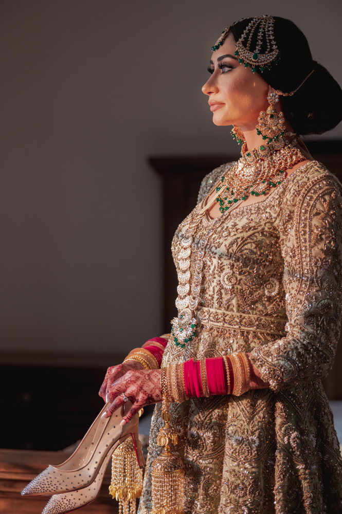 A bride in an ornate, gold-embroidered wedding dress stands sideways, holding a pair of embellished high heels. She is adorned with intricate jewelry, including necklaces, earrings, and a headpiece. Her hands display henna designs and vibrant pink bangles.