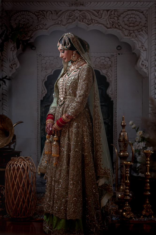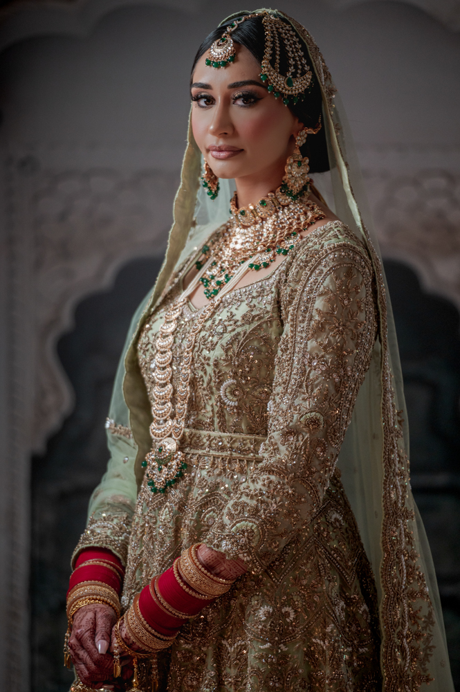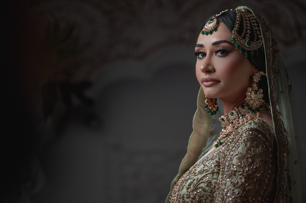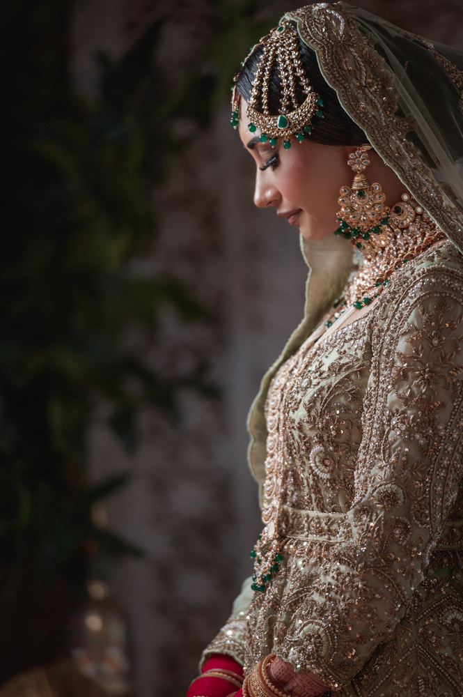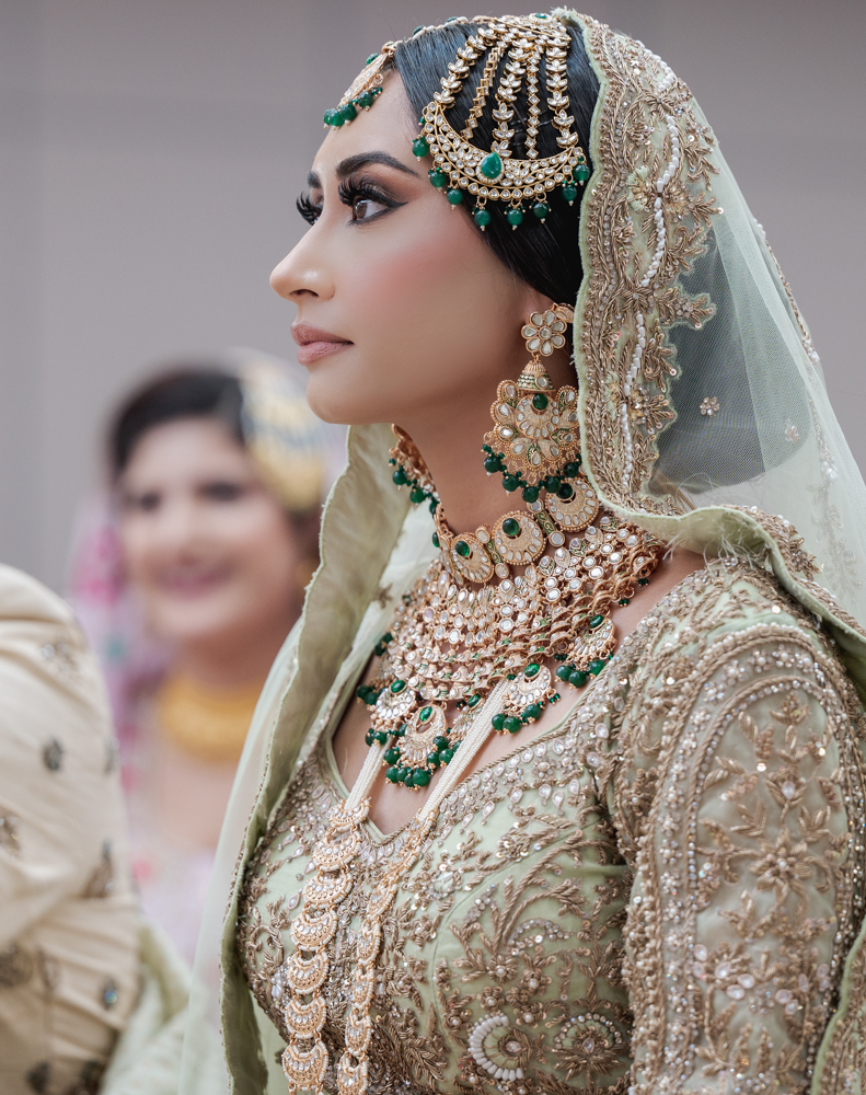A woman dressed in ornate, traditional bridal attire gazes to the side. She wears a green and gold outfit embellished with intricate embroidery and jewels. Her head is adorned with a matching jeweled headpiece and veil, complemented by elaborate jewelry.
