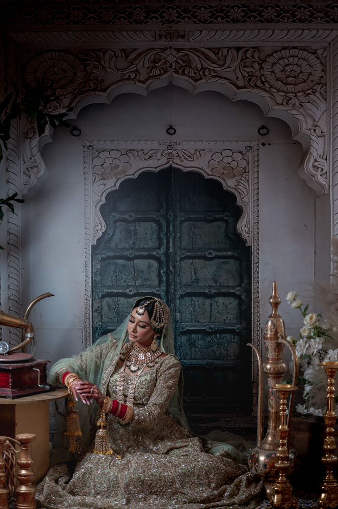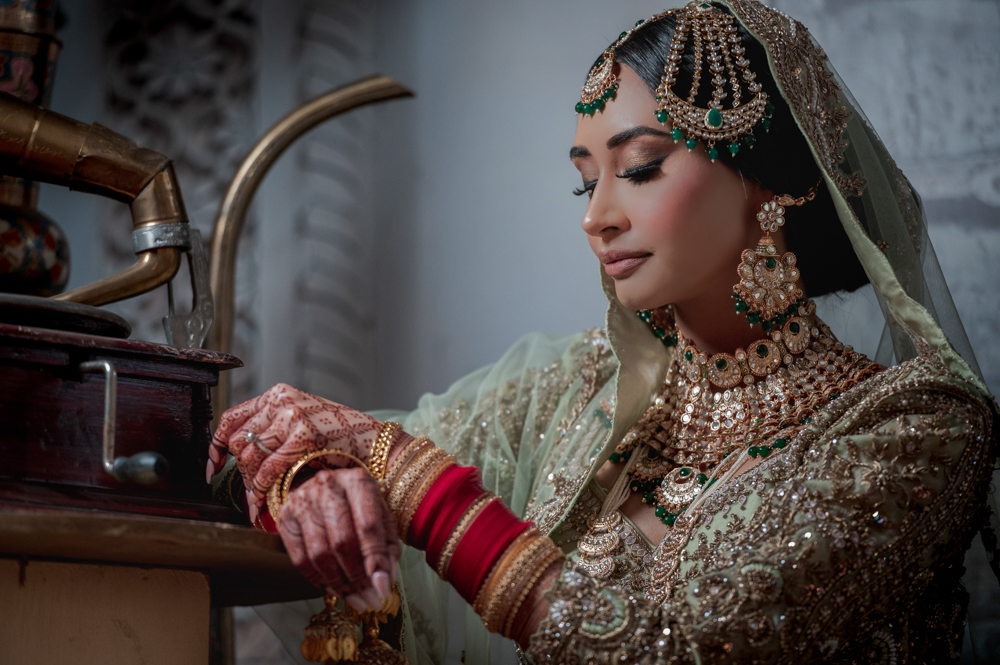 Woman in elaborate traditional bridal attire and jewelry, with henna designs on her hands, posing beside a gramophone. She wears a green and gold embroidered outfit, a headpiece, and layered necklaces, exuding elegance and cultural richness.