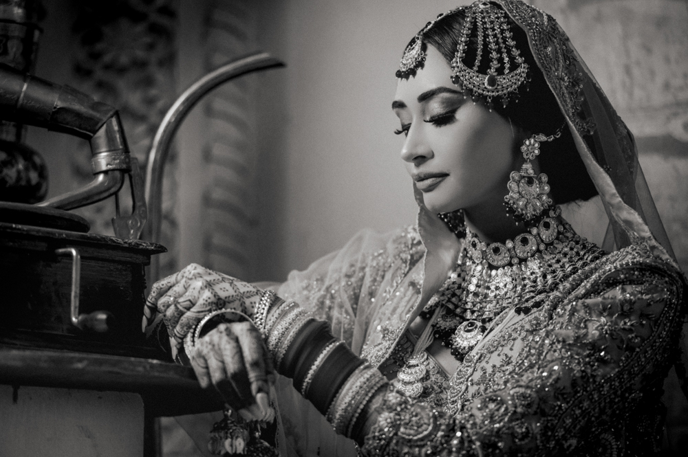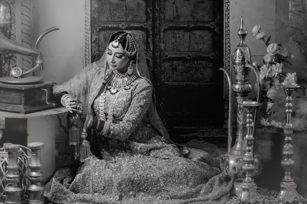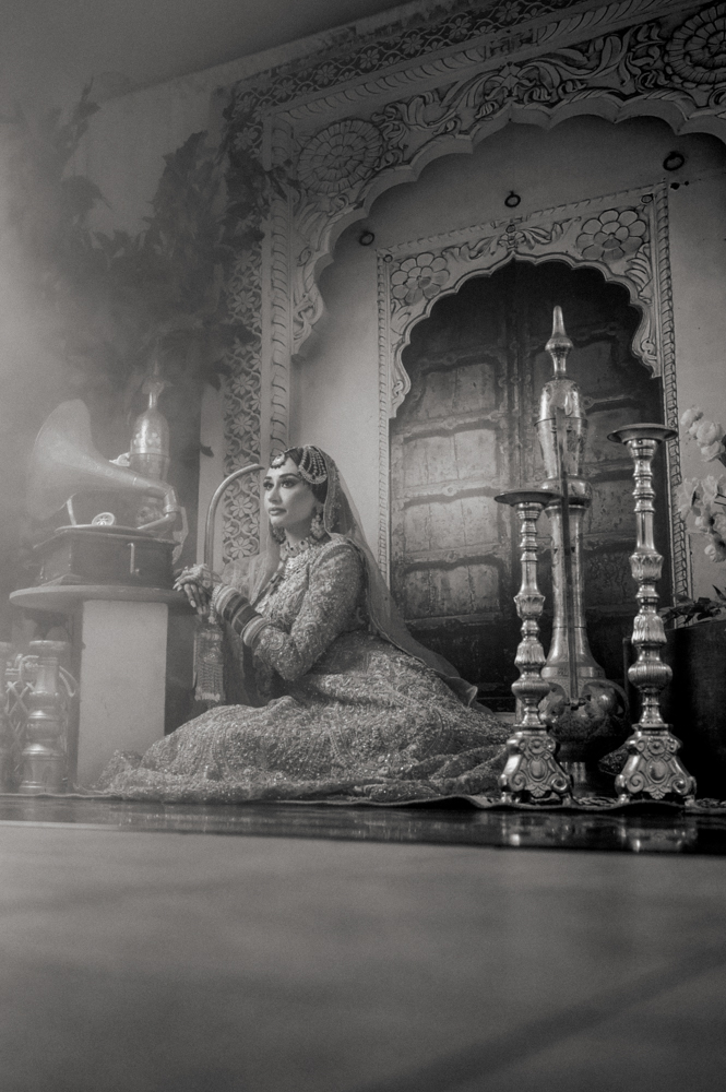 A woman dressed in traditional bridal attire sits on the floor in front of an ornate arched doorway. She is adorned with intricate jewelry and a veil. Beside her are two tall, decorative candle stands and an antique gramophone. The scene is captured in black and white.