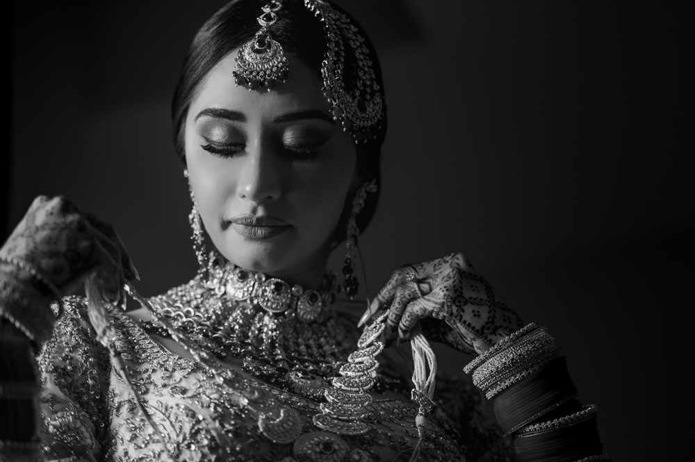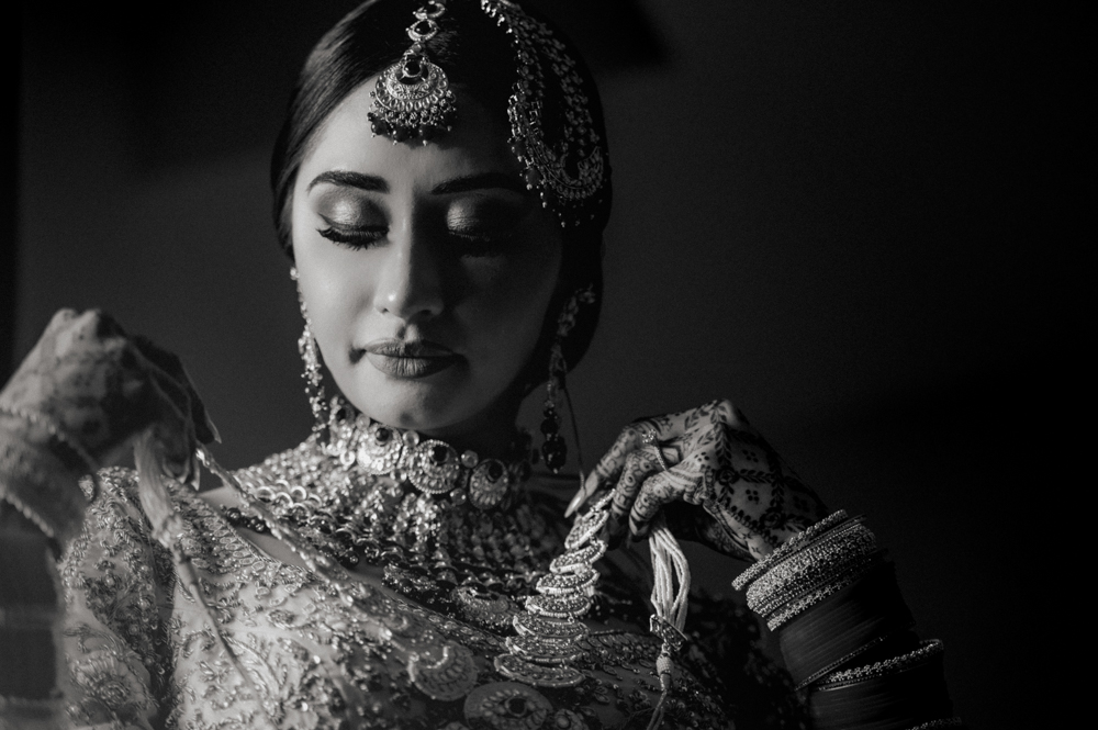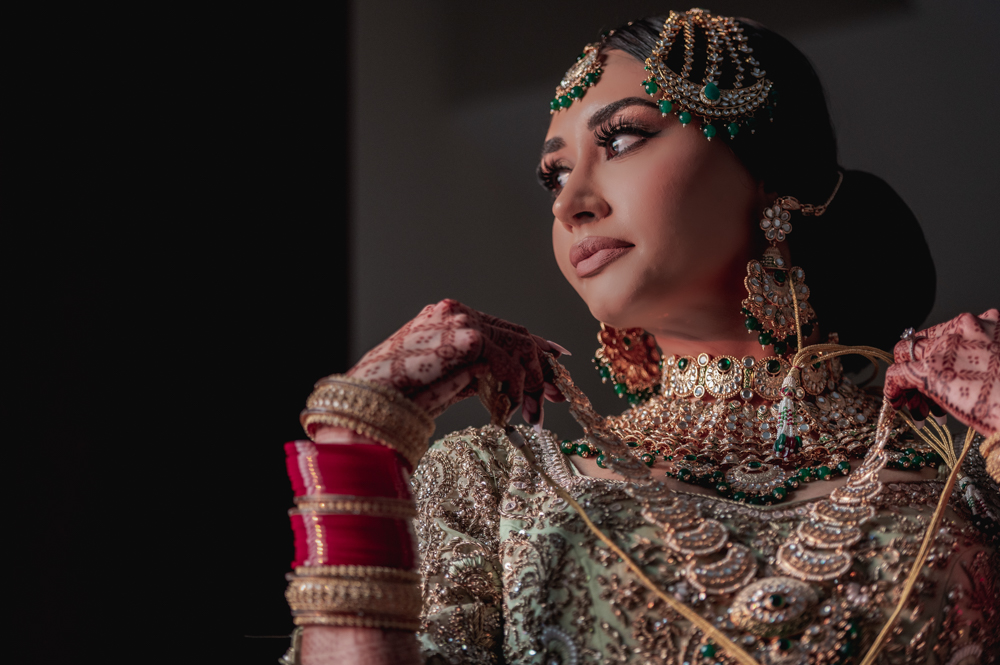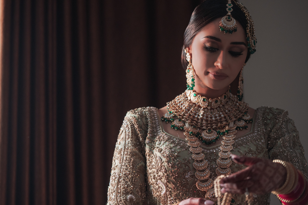 A bride dressed in a heavily embroidered traditional outfit adorned with intricate jewelry, including an ornate necklace, earrings, tikka, and bangles, stands against a dark background, looking down as she adjusts her jewelry. Her hands feature intricate henna designs.