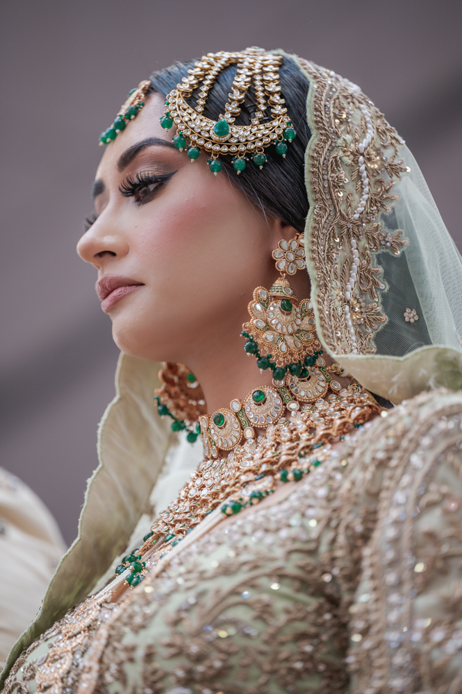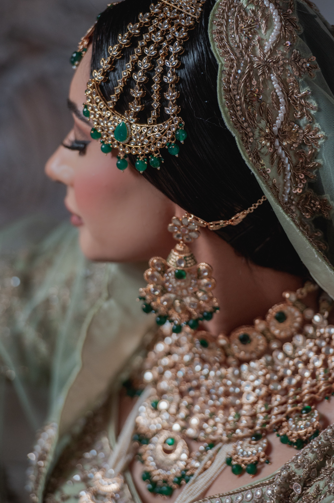 A woman dressed in intricate traditional attire with a heavily embroidered veil and ornate jewelry including a maang tikka, large earrings, and an elaborate necklace, is looking off to the side. The jewelry features green and gold details.