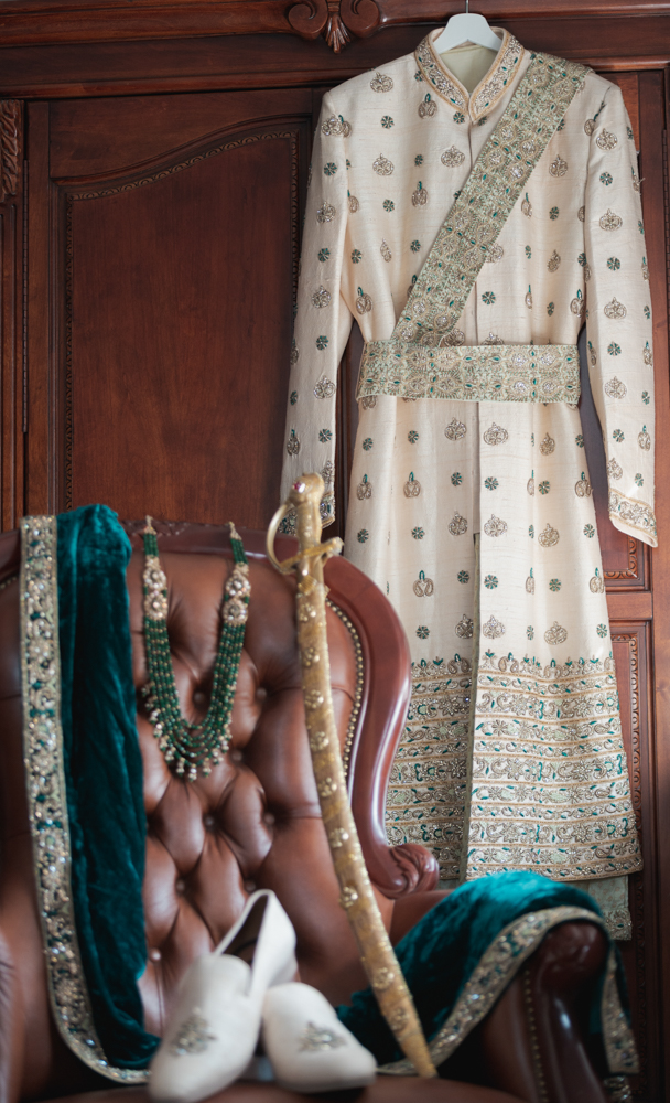 A luxurious, embroidered cream-colored sherwani hangs on a wooden armoire. Below, a matching sword, a pair of white traditional shoes, and an ornate green velvet shawl with golden embellishments rest on a brown leather chair. Green beaded jewelry is also draped on the shawl.