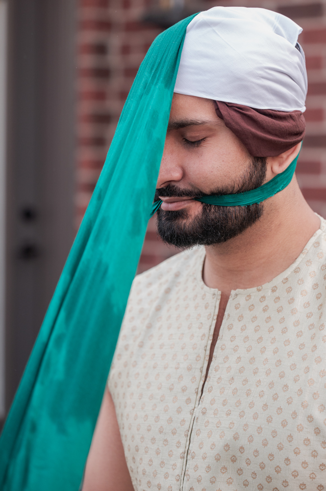A man stands with his eyes closed, wearing a patterned beige shirt and a multi-colored turban with cloth in teal, white, and brown. The teal cloth trails from the turban down to his beard, which it winds through. A brick wall is visible in the background.