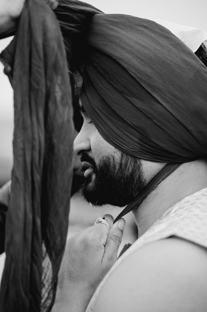 A black and white photo shows the side profile of a bearded individual wearing a vest while adjusting a long piece of cloth over their head, likely wrapping a turban. The person's hand, adorned with a ring, holds the cloth in place.