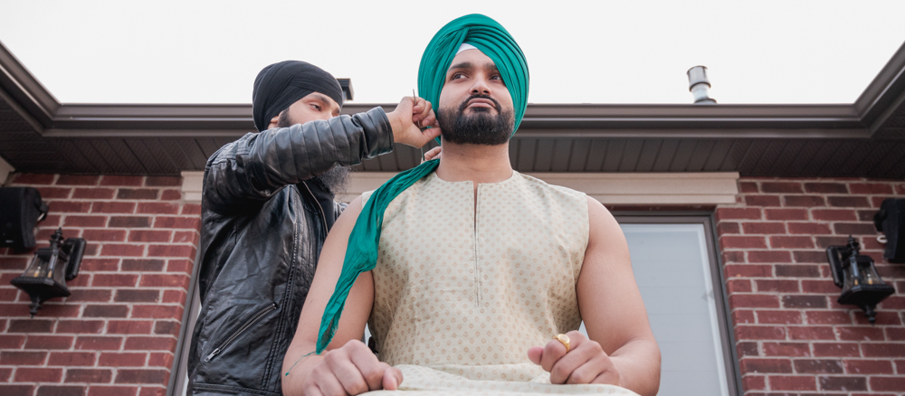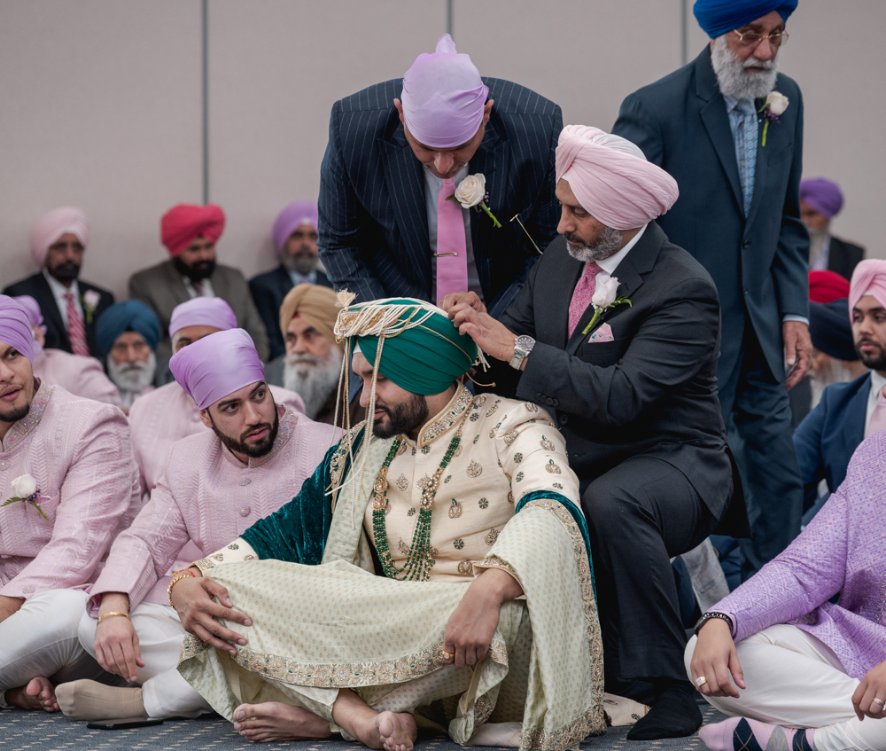 A groom sits cross-legged on the floor wearing traditional Indian wedding attire, while several men help adjust his turban. The groom and men wear pastel-colored turbans. More onlookers, also in traditional attire, are seated in the background.