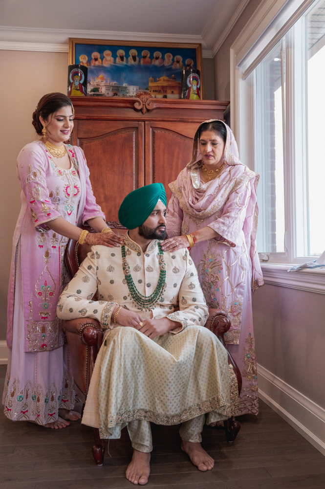 A seated man in traditional attire is being adjusted by two standing women, also in traditional clothing. The man wears a green turban and a beige sherwani, while the women wear pink dresses. They are in a room with a large wooden cabinet and a window.