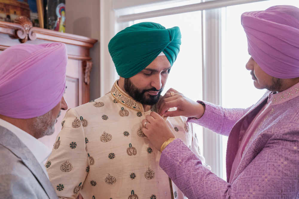 Three men are preparing for an event in a room. One man in a green turban is being assisted with his beige and gold sherwani by a man in a purple turban. Another man in a pink turban watches them. They are standing near a window with white blinds.