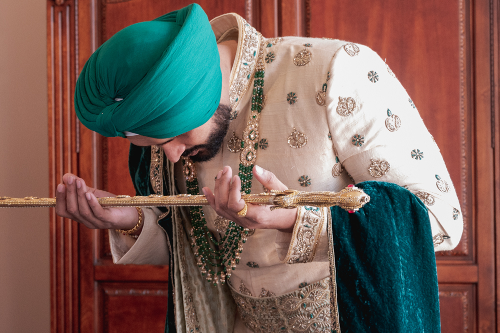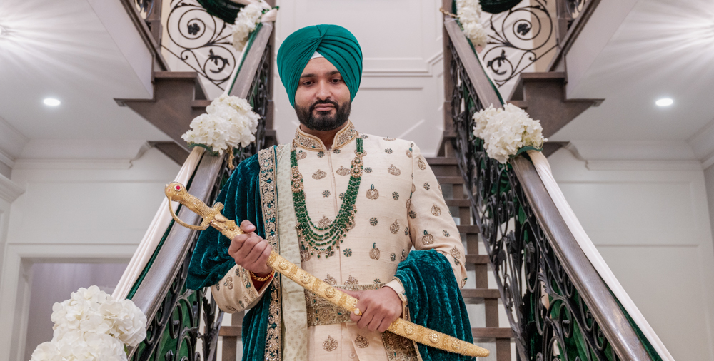 A man wearing a traditional embroidered cream sherwani with green and gold accessories, including a green turban and layered necklaces, stands on a staircase adorned with white floral decorations. He holds an ornate sword and gazes confidently at the camera.