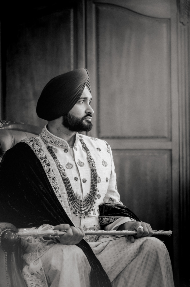 A black-and-white photo of a man wearing traditional South Asian attire, including an ornate sherwani with intricate embroidery and a turban. He is seated on a chair, holding a ceremonial staff, and looking to the side with a thoughtful expression.