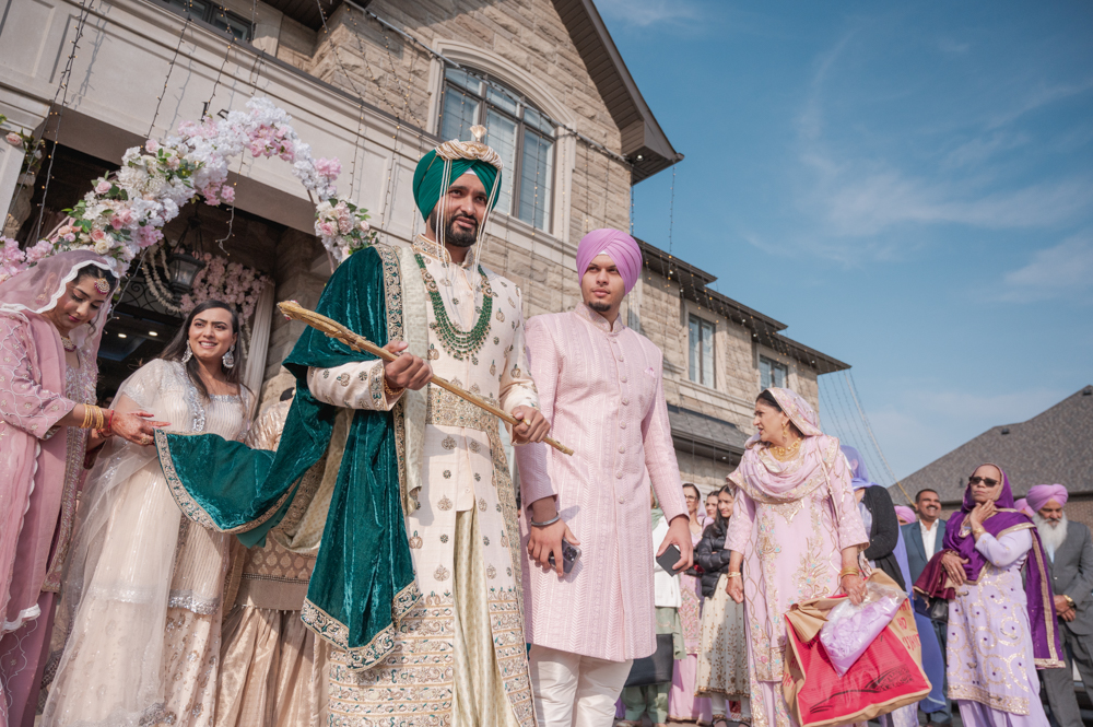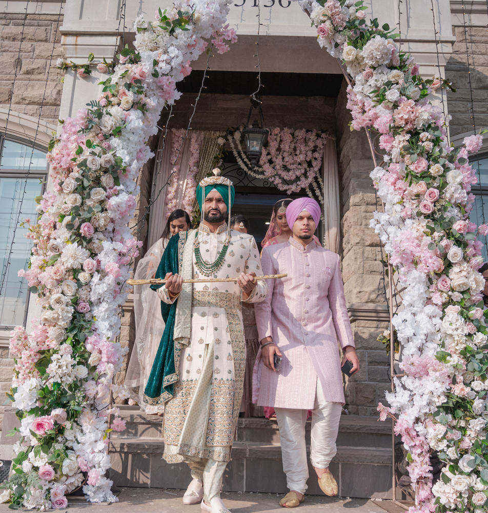 A groom wearing traditional attire adorned with a green turban and intricate embroidery walks beside another man dressed in a pink sherwani and turban. They are beneath a decorated floral archway at an outdoor venue. Two women in traditional clothing stand behind them.
