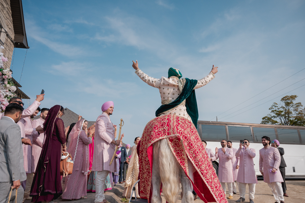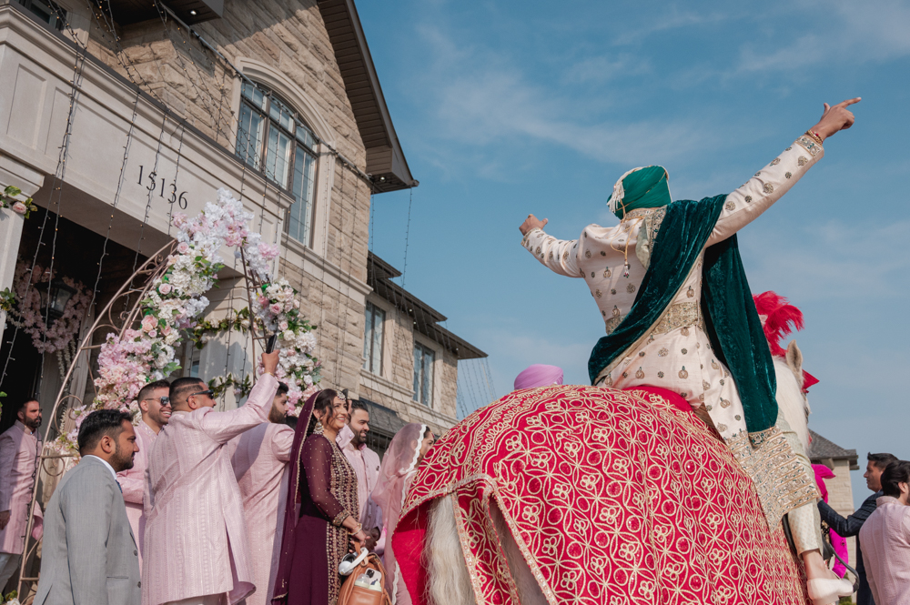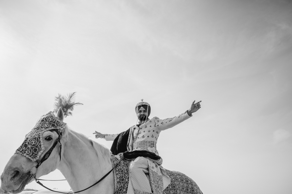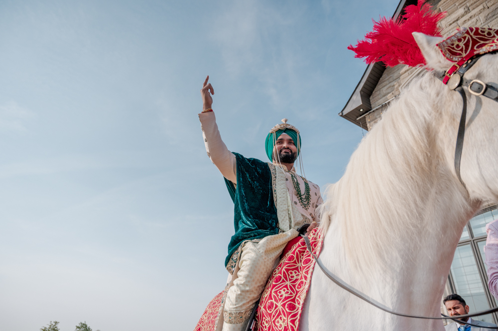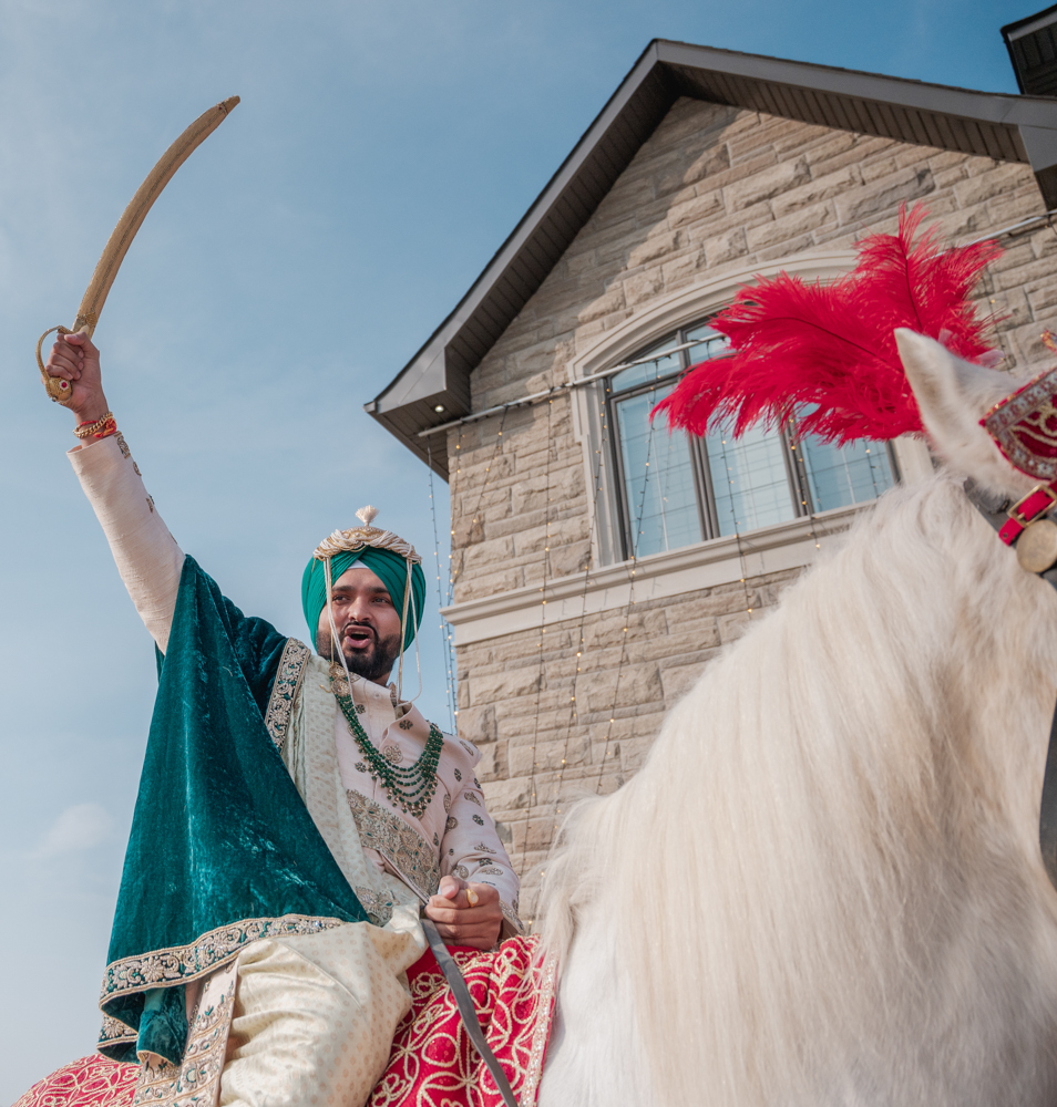A groom in a traditional Indian wedding attire, including a turban and ceremonial sword, rides a decorated white horse outside a stone house. His arm is raised in celebration and the sky is clear and blue.