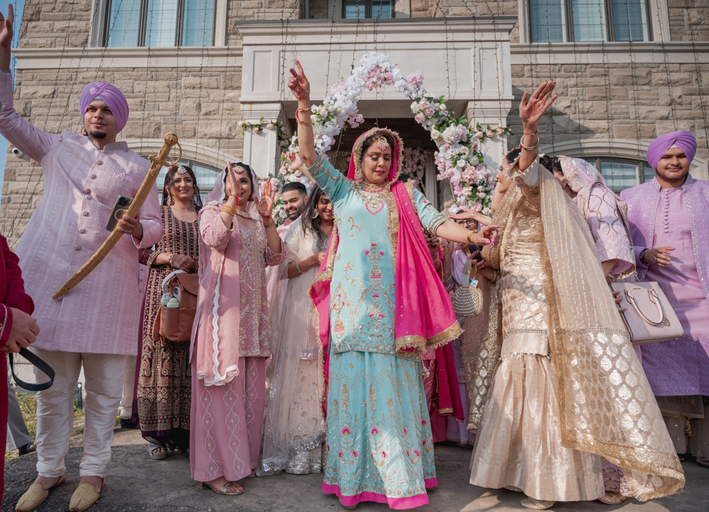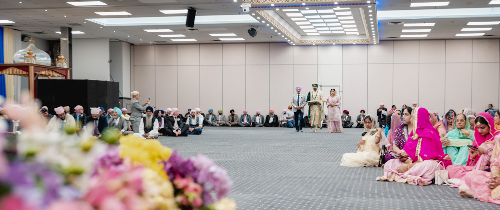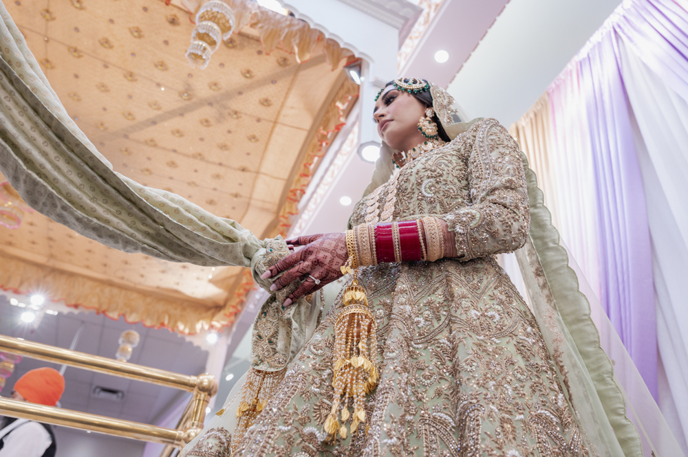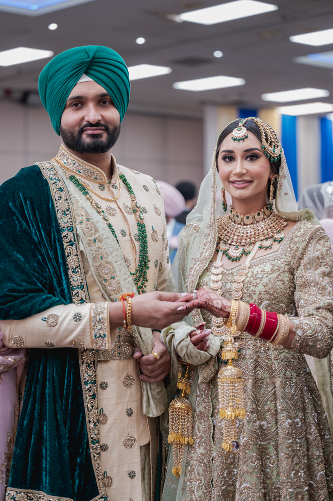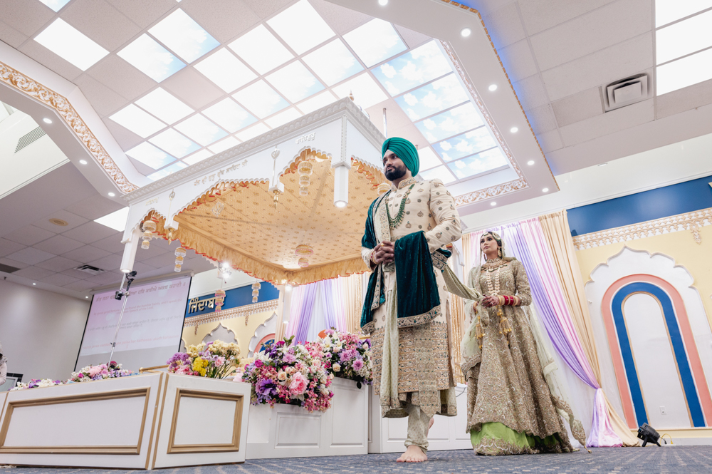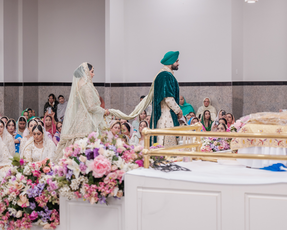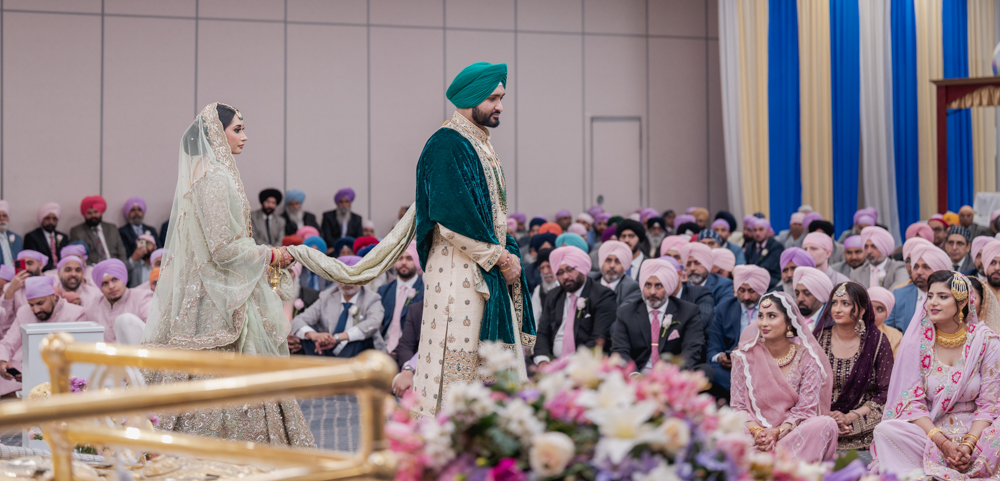 A couple, dressed in traditional wedding attire, walks hand-in-hand during a Sikh wedding ceremony. The bride in a light-colored lehenga and the groom in a green turban and cream sherwani, are surrounded by seated guests, with a backdrop of blue and gold drapes.