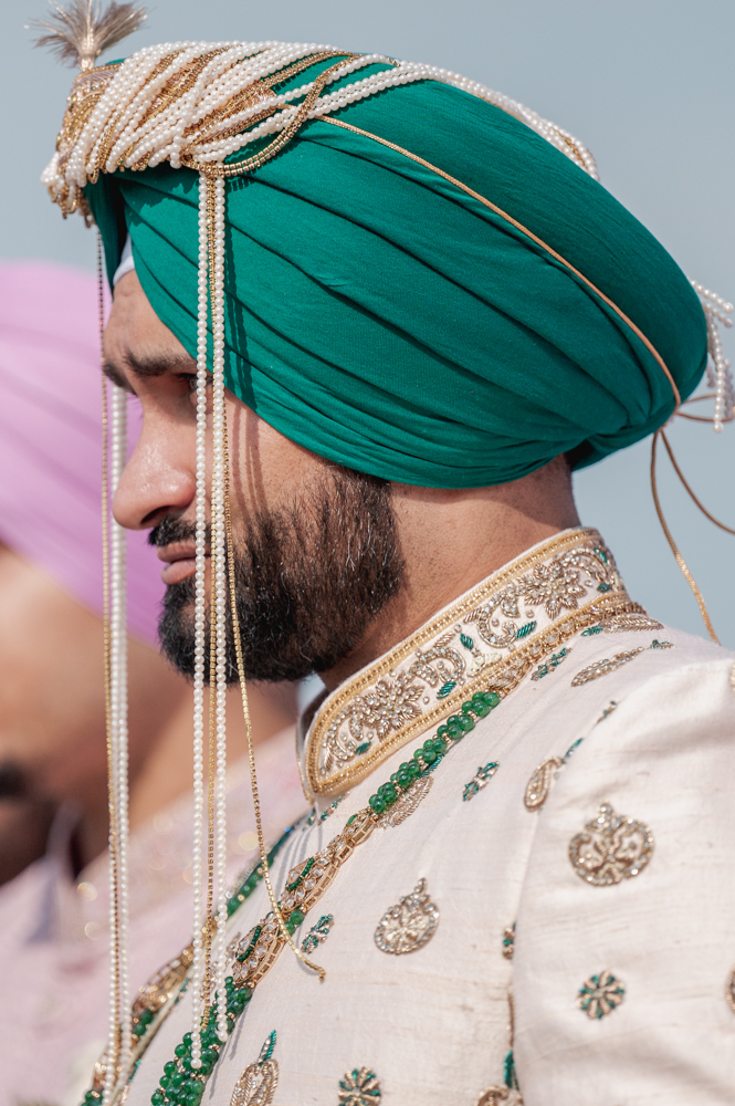 A side profile of a man wearing a green turban with decorative strings of pearls and an off-white sherwani intricately embroidered with gold and green details, likely attending a traditional ceremony. His beard and serious expression are prominently visible.