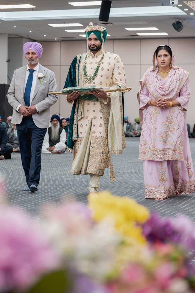 A groom in a traditional Indian wedding outfit walks down the aisle, flanked by an elderly man and woman in traditional attire. Colorful flowers blur the foreground, and seated guests fill the background of a large, well-lit hall.
