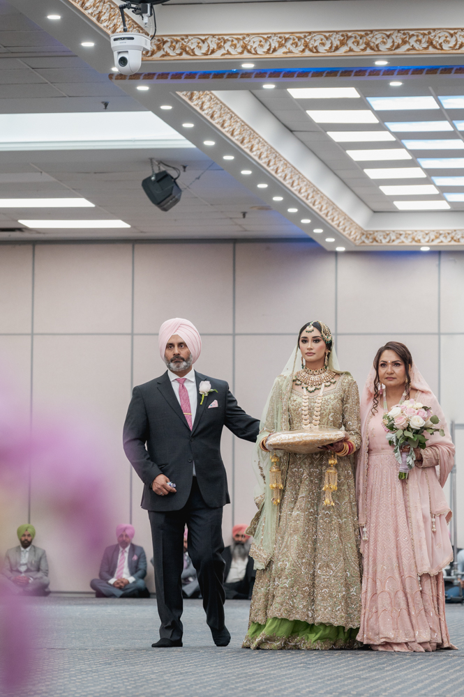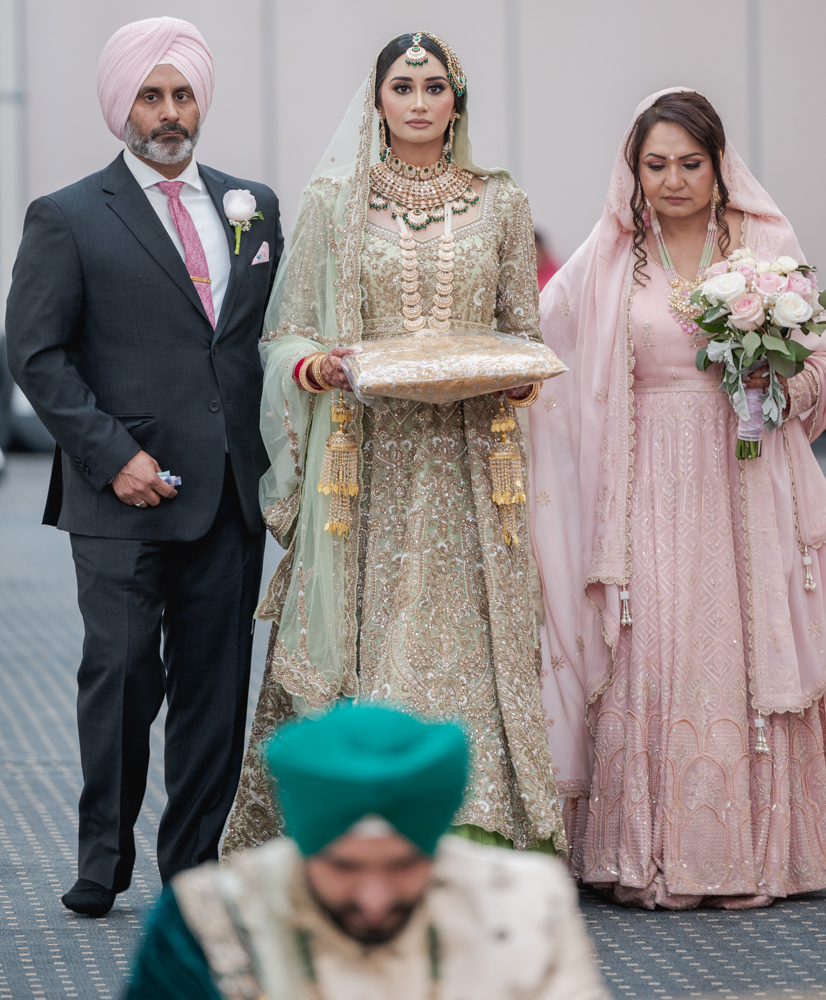 A bride in a traditional green bridal outfit is walking down the aisle, flanked by a man in a suit and turban on her left and a woman in a pink dress on her right. The setting appears to be indoors, with other seated guests visible in the background.
