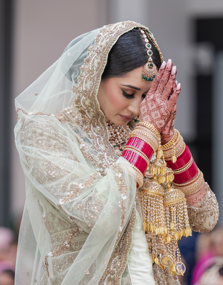 A bride dressed in an ornate, light-colored traditional outfit and veil, with intricate henna designs on her hands, holds her palms together in a respectful gesture. She wears multiple bangles and heavy jewelry, including a pendant on her forehead.
