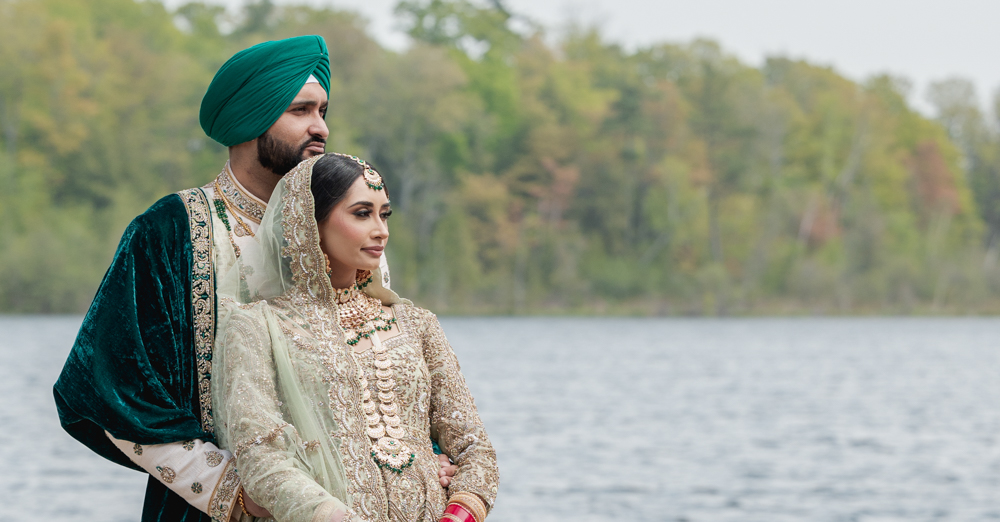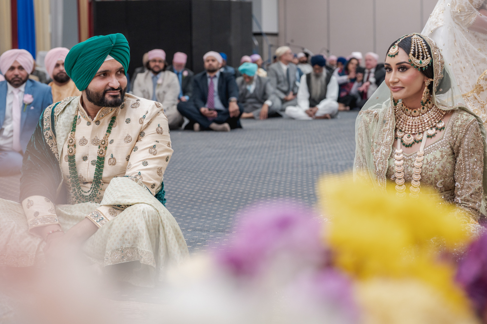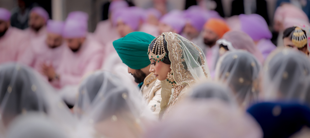 A bride and groom wearing traditional Punjabi wedding attire sit with their heads slightly bowed during a ceremony. The bride is adorned in a heavily embroidered outfit with a jeweled headpiece and veil. The groom wears a green turban. Attendees in pastel turbans are seen in the background.