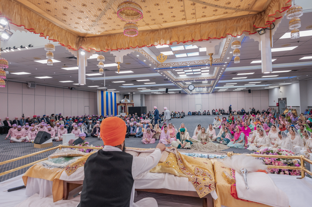 A seated Sikh priest faces a congregation within a gurdwara. The space is elaborately decorated, with men and women dressed in traditional attire seated on the floor, observing a religious ceremony. The gurdwara features ornate ceiling designs and bright lighting.