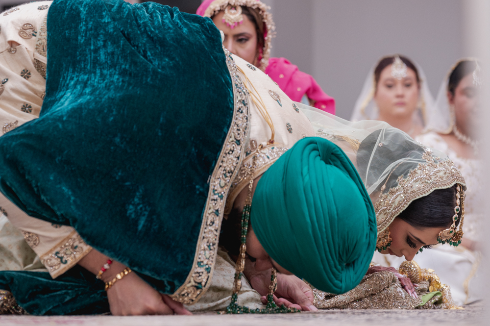 A couple in traditional Indian attire bows down in a gesture of reverence during a ceremony. The man wears a green turban and velvet robe, while the woman is adorned with an intricate shawl and jewelry. Other individuals, also in traditional clothing, are visible in the background.