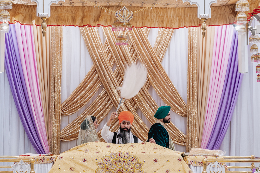A man in an orange turban waves a ceremonial fan, while another man in a green turban stands next to him. They are on a ornately decorated stage draped with gold, purple, and pink fabric, engaged in a religious ritual.