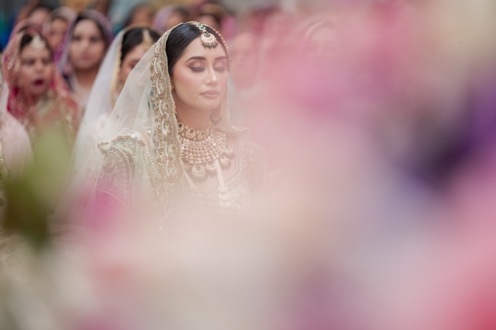 A bride dressed in traditional attire with elaborate jewelry and a veil stands with her eyes closed, surrounded by blurred figures and vibrant floral decorations in the foreground. The image conveys a serene and sacred moment during a wedding ceremony.