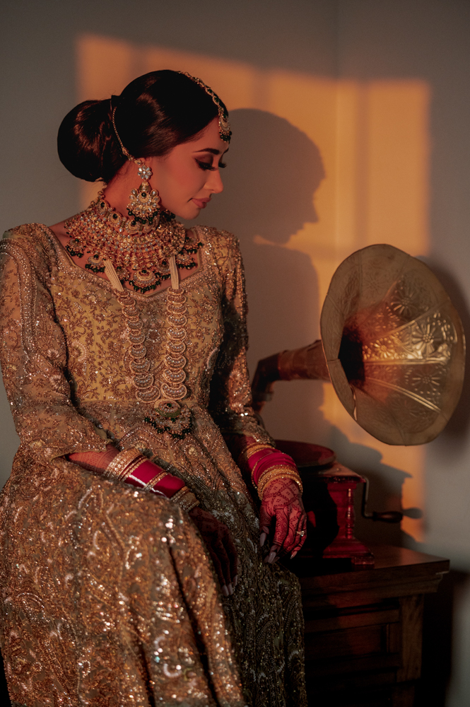 A woman dressed in an elaborate traditional outfit adorned with heavy gold jewelry and wearing henna on her hands sits beside an antique gramophone. The scene is softly lit by warm sunlight, casting a gentle shadow on the wall behind her.