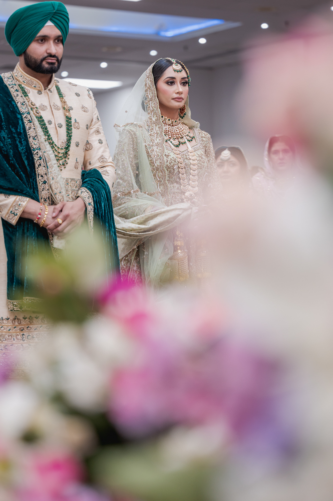 A bride and groom in traditional attire stand side by side at a wedding ceremony. The groom wears a green turban and a beige sherwani, while the bride wears an elaborate light green outfit with matching jewelry. Blurred flowers are in the foreground.