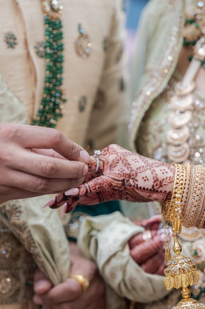 A close-up of an engagement ceremony showing a person placing a ring on another person's henna-adorned hand. Both individuals are wearing traditional, intricately decorated attire in green and gold, and gold jewelry. The background shows their ornate clothing details.