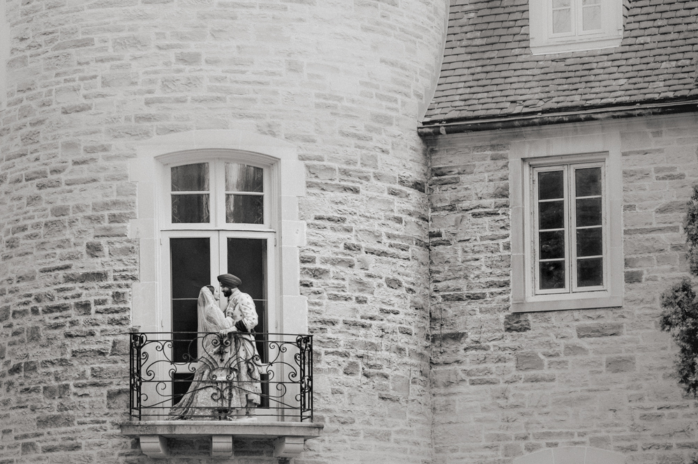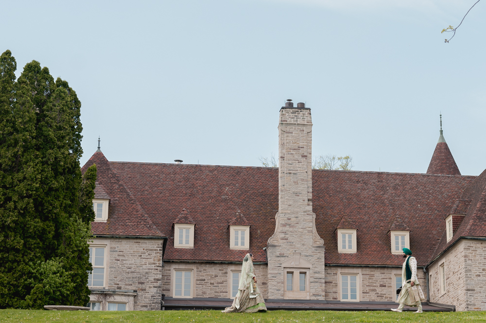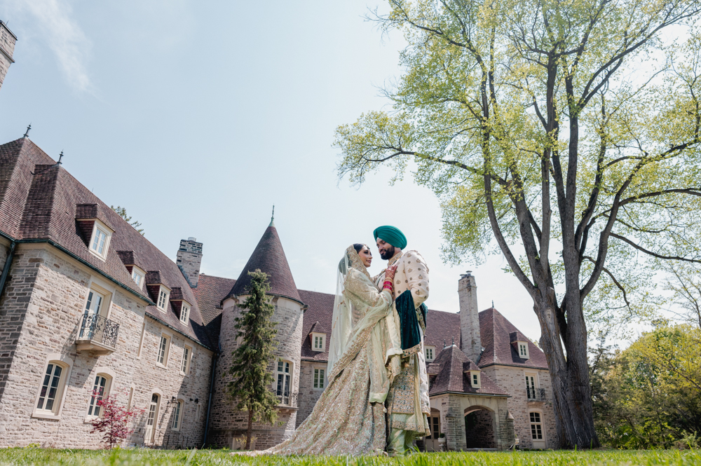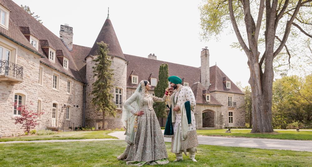 A couple dressed in traditional South Asian wedding attire stand outdoors in front of a large, stone building with turrets and tall windows. The bride wears an intricate gown and veil, while the groom sports a green turban and elaborately embroidered clothing.