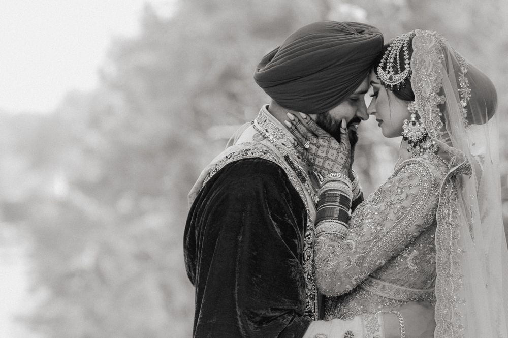 A couple in traditional attire shares an intimate moment on their wedding day. The groom, wearing a turban and sherwani, gently holds the bride’s face. The bride, adorned in an ornate dress and headpiece, closes her eyes, leaning into the groom.