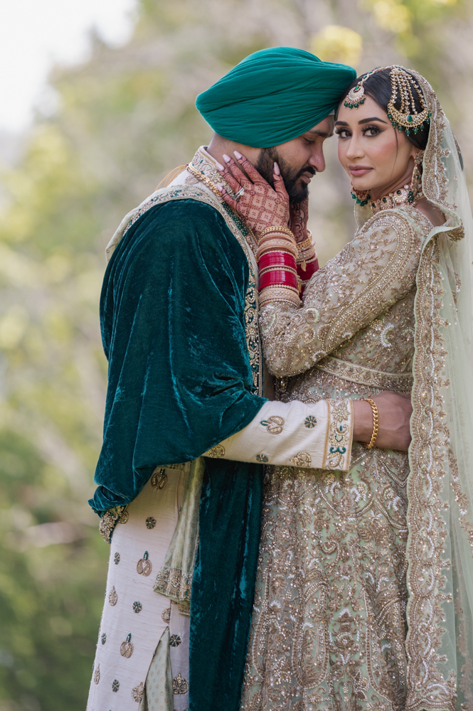 A couple in traditional wedding attire stands closely, gazing into each other's eyes. The man wears a green turban and a white and green embroidered outfit. The woman is dressed in an ornate gold and beige lehenga with intricate jewelry. The background features lush greenery.