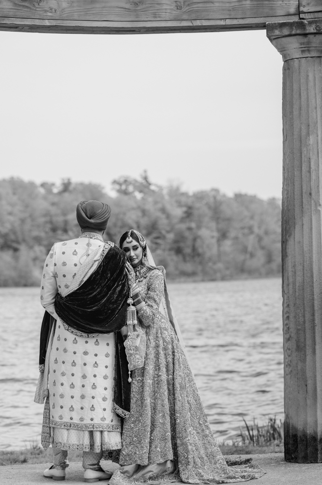 A black and white photo of a couple standing near a large body of water. The man is wearing a turban and traditional attire. The woman, adorned in a detailed sari, leans affectionately on the man's shoulder. They are framed by columns and trees can be seen in the background.