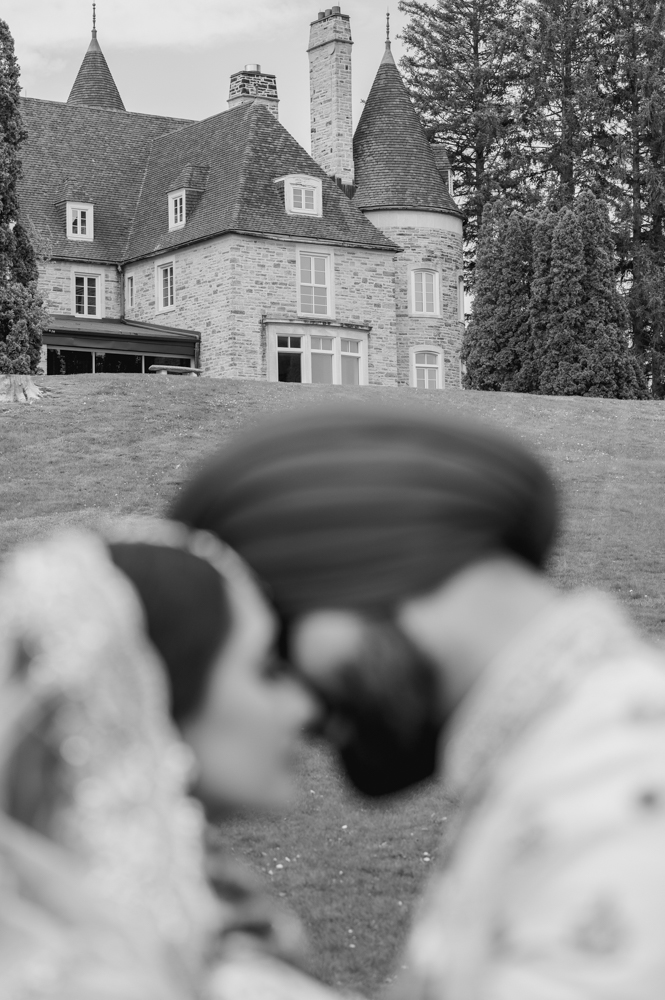 A black and white photograph depicting a blurred couple in traditional attire standing closely with their foreheads touching. In the background, a large stone mansion with towers and tall trees is in focus.
