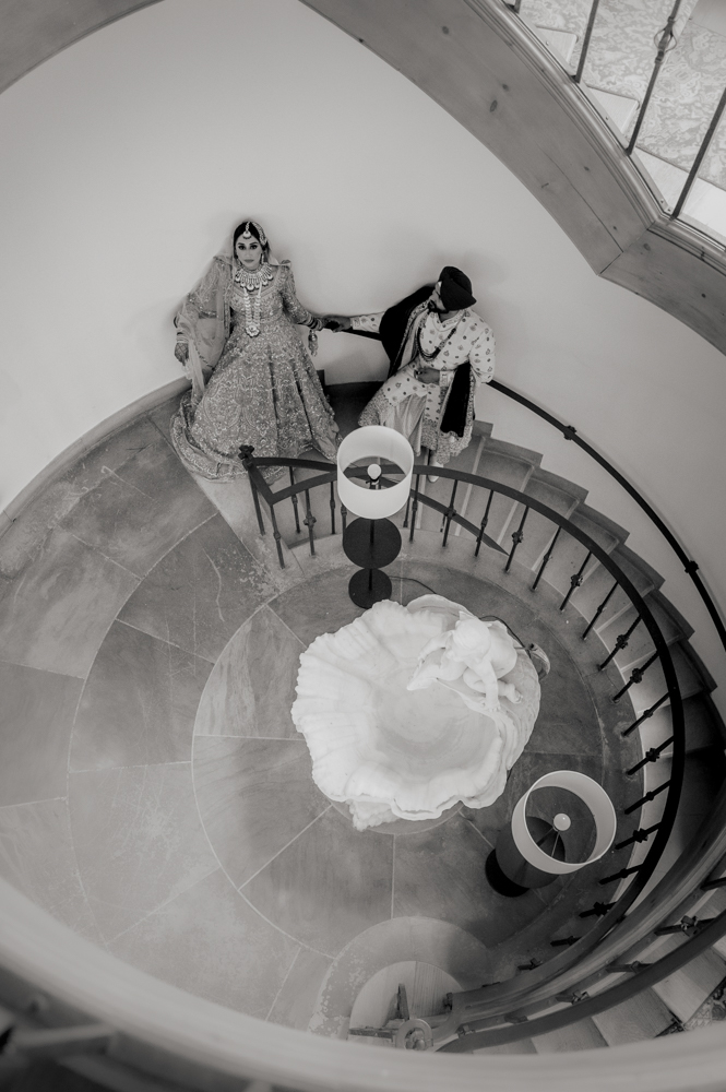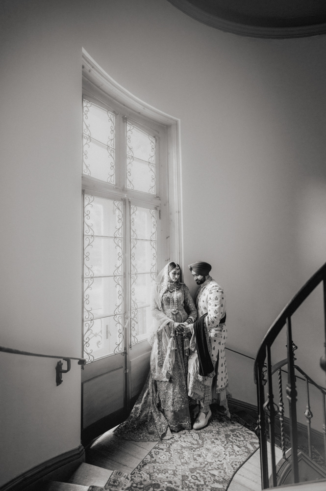 A couple dressed in traditional South Asian wedding attire stand on a wooden staircase inside a grand house. The woman is on the upper part of the stairs, wearing a heavily embroidered lehenga, and the man, on the lower part, wears a sherwani and turban.