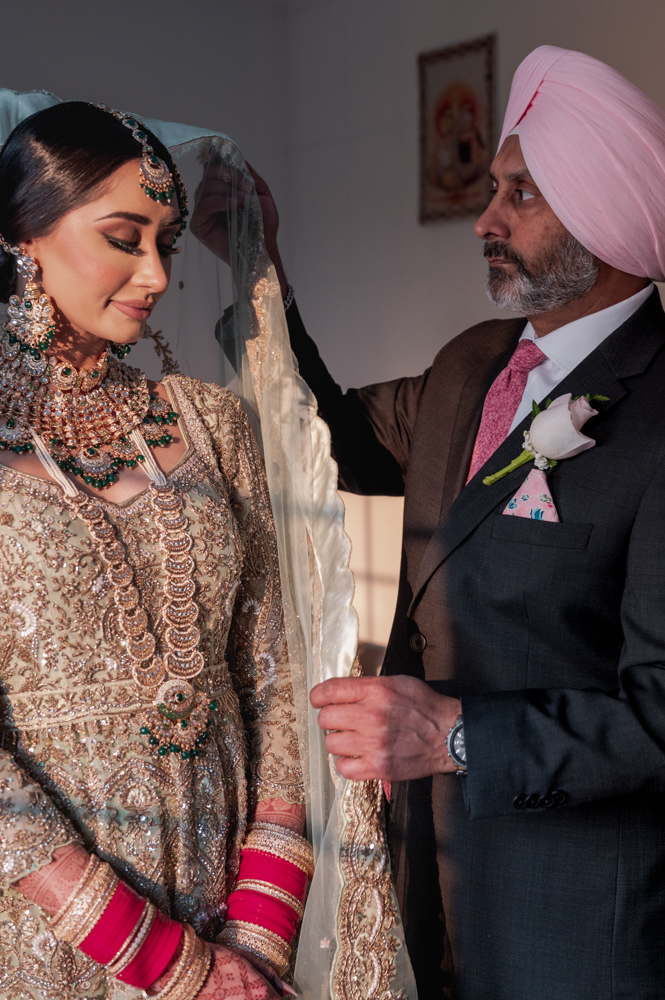 A man wearing a suit and pink turban is gently placing a veil over a woman dressed in ornate traditional attire with heavy jewelry. The woman looks down with a serene expression. Both are in a softly lit room, adding a warm ambiance to the scene.